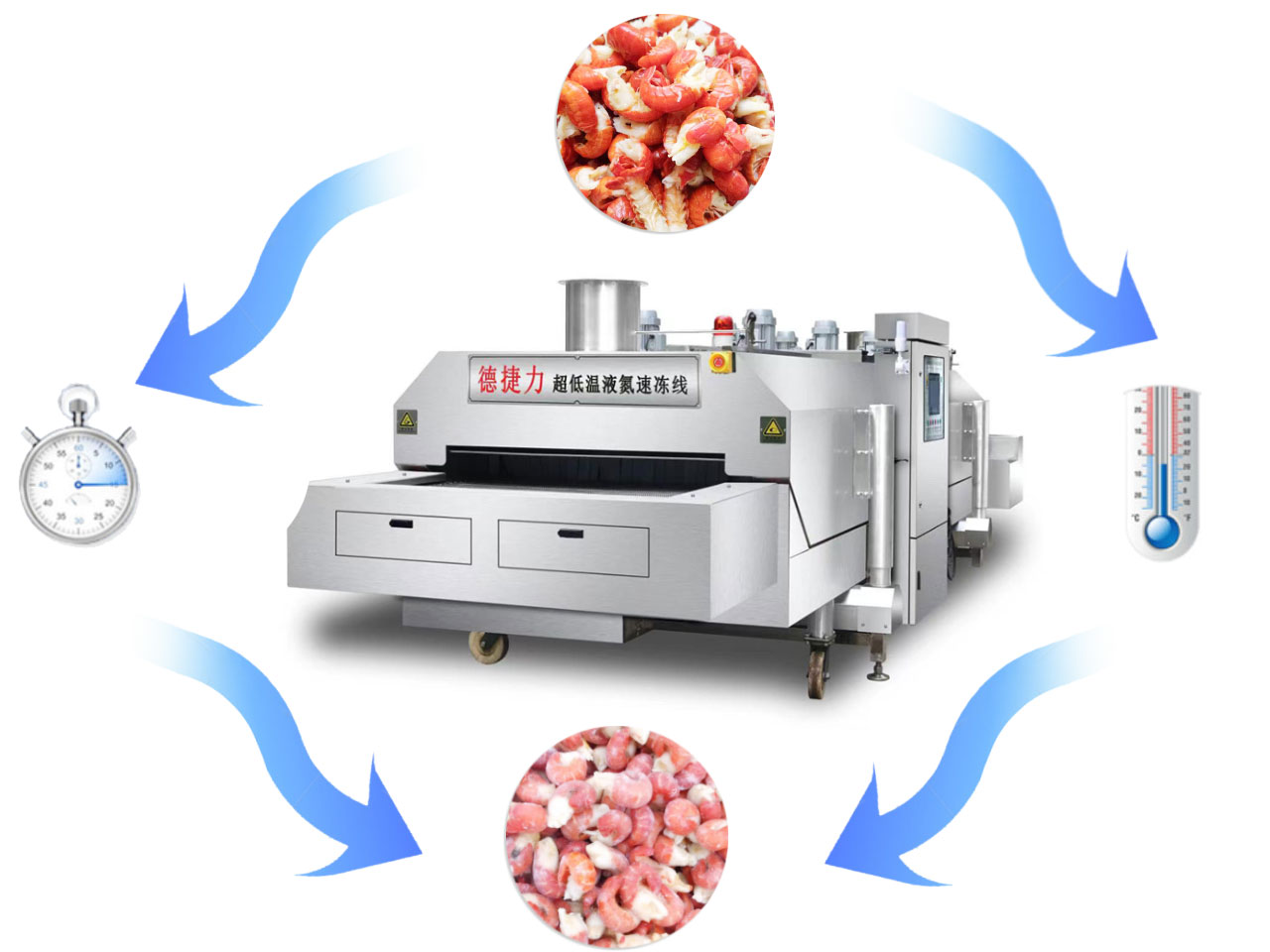 Dejieli liquid nitrogen rapid freezing equipment achieves an extreme low temperature of -196°C. When pre-frozen products come into contact with the ultra-low temperature rapid freezing equipment, they rapidly vaporize, instantly removing heat from the product surface through thermal exchange. Within seconds, the product traverses the ice crystal growth zone, forming uniformly distributed microcrystals throughout the frozen food structure. This instantly locks in moisture with virtually no loss, preserving the food's original color, flavor, texture, and shape.