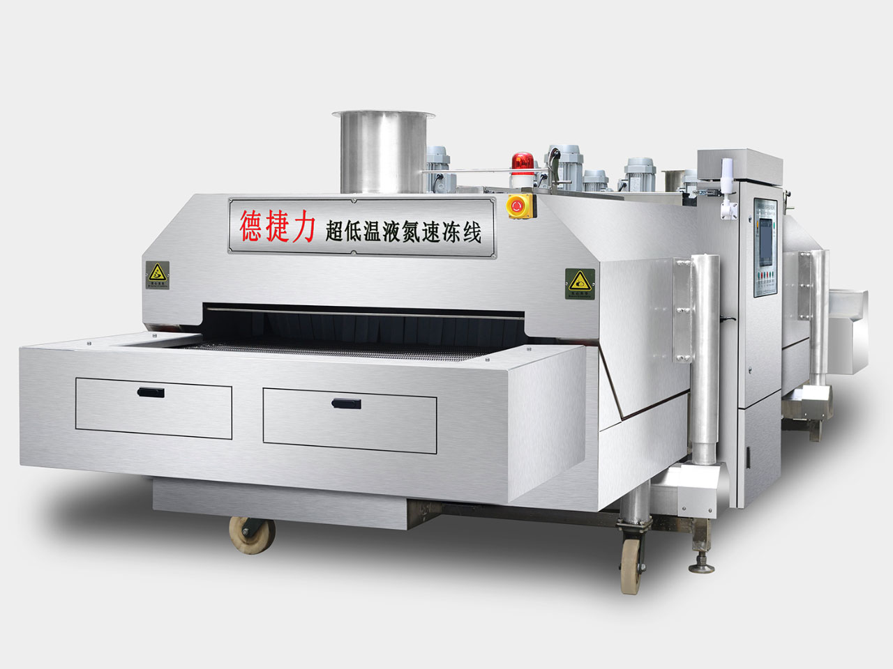 Dejie Li quick-freezing equipment features a programmable logic controller (PLC) with an intuitive human-machine interface for simple and convenient operation. It supports preset production modes, allowing seamless switching between different product processes while ensuring consistent batch-to-batch consistency. The tunnel-type quick-freezer employs a modular vertical lift design for high flexibility, enabling easy configuration adjustments based on production capacity needs. This design also facilitates maintenance and servicing.